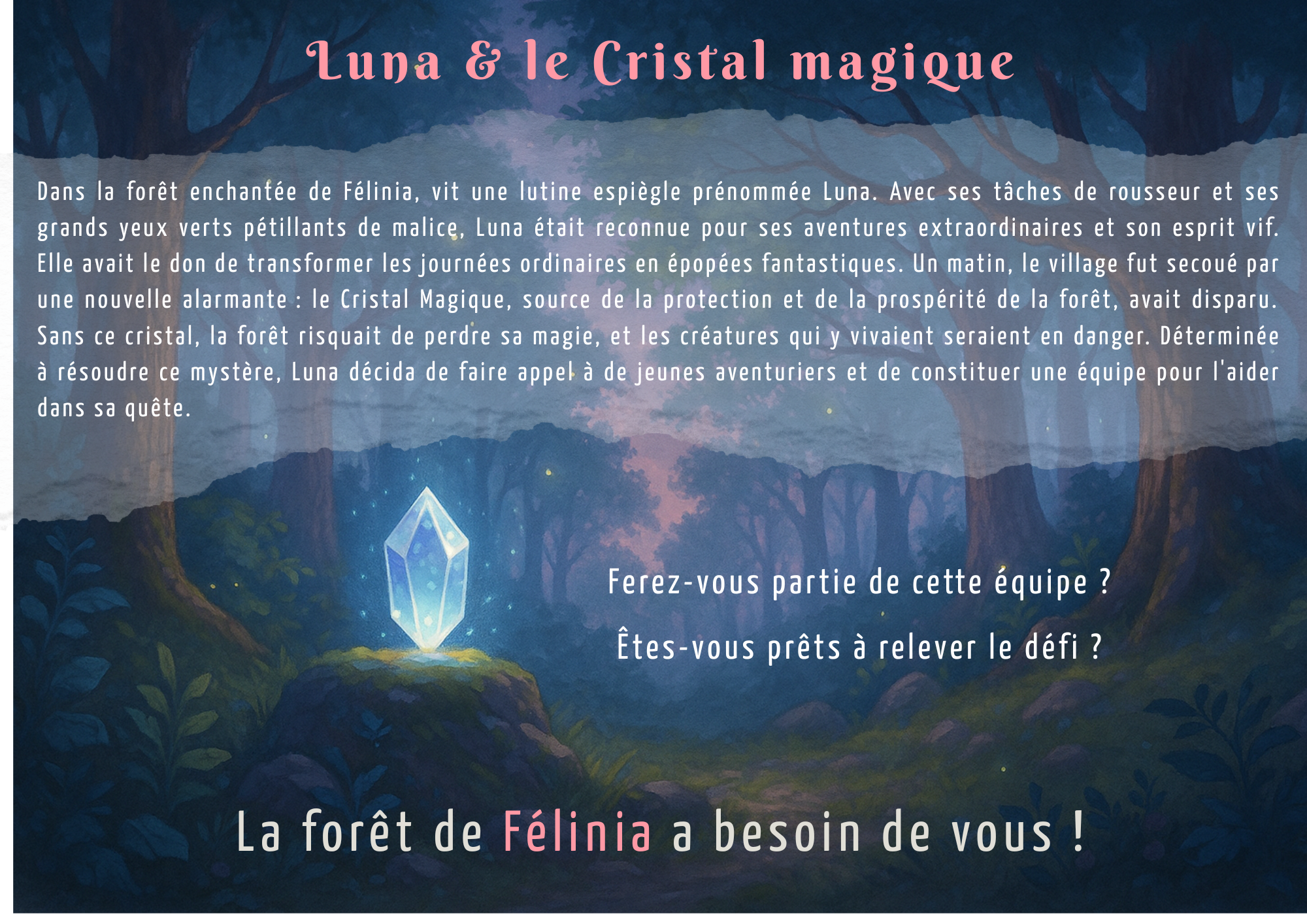 Au cœur de la forêt enchantée de Félinia, la jeune lutine Luna découvre que le Cristal Magique, source de protection et d’harmonie a disparu. Sans ce cristal, la magie de la forêt s’éteint peu à peu, les animaux deviennent silencieux, les fleurs perdent leurs couleurs... Un mystérieux esprit farceur semble avoir semé le trouble.
